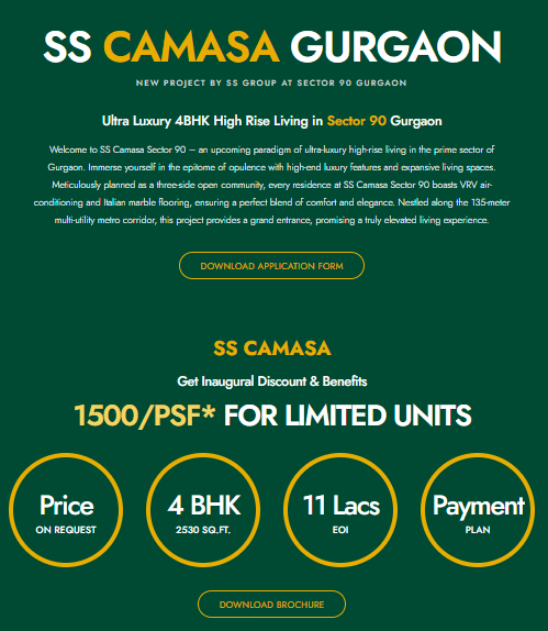 Situated in the prominent Sector 90 of New Gurgaon, the SS Camasa Gurgaon project is a three-sided open residential enclave strategically placed along the lively 135-meter wide and 16-lane Multi Utility Corridor. With additional access points from 24 and 18-meter wide roads, it seamlessly integrates into the well-surrounded D L F Township. This prime location is just a 2-minute drive from Dwarka Expressway.